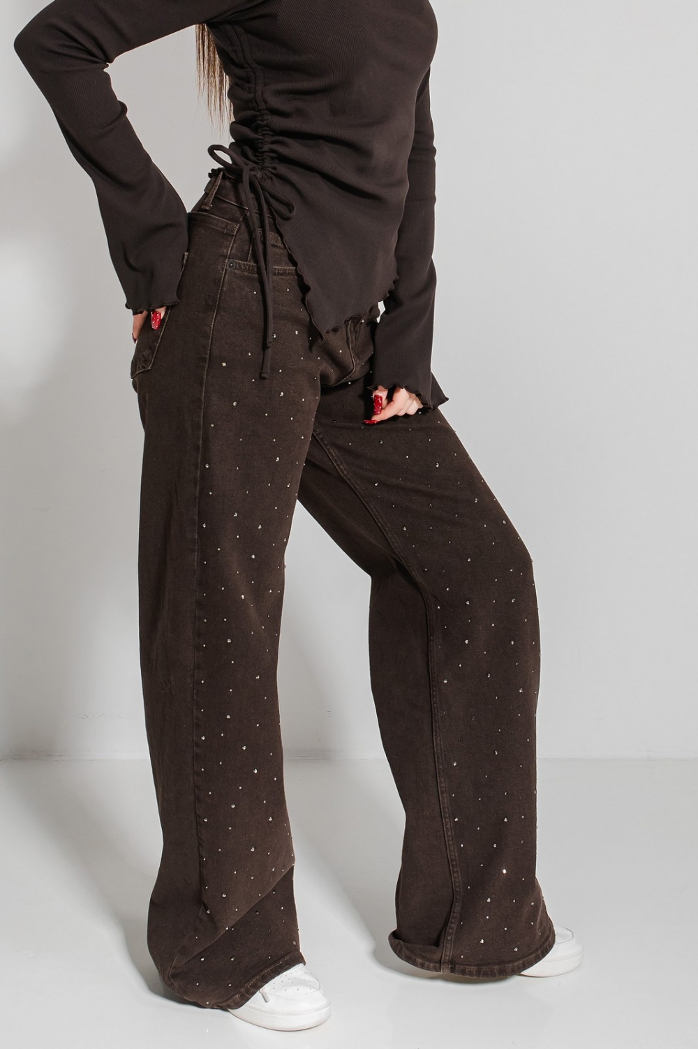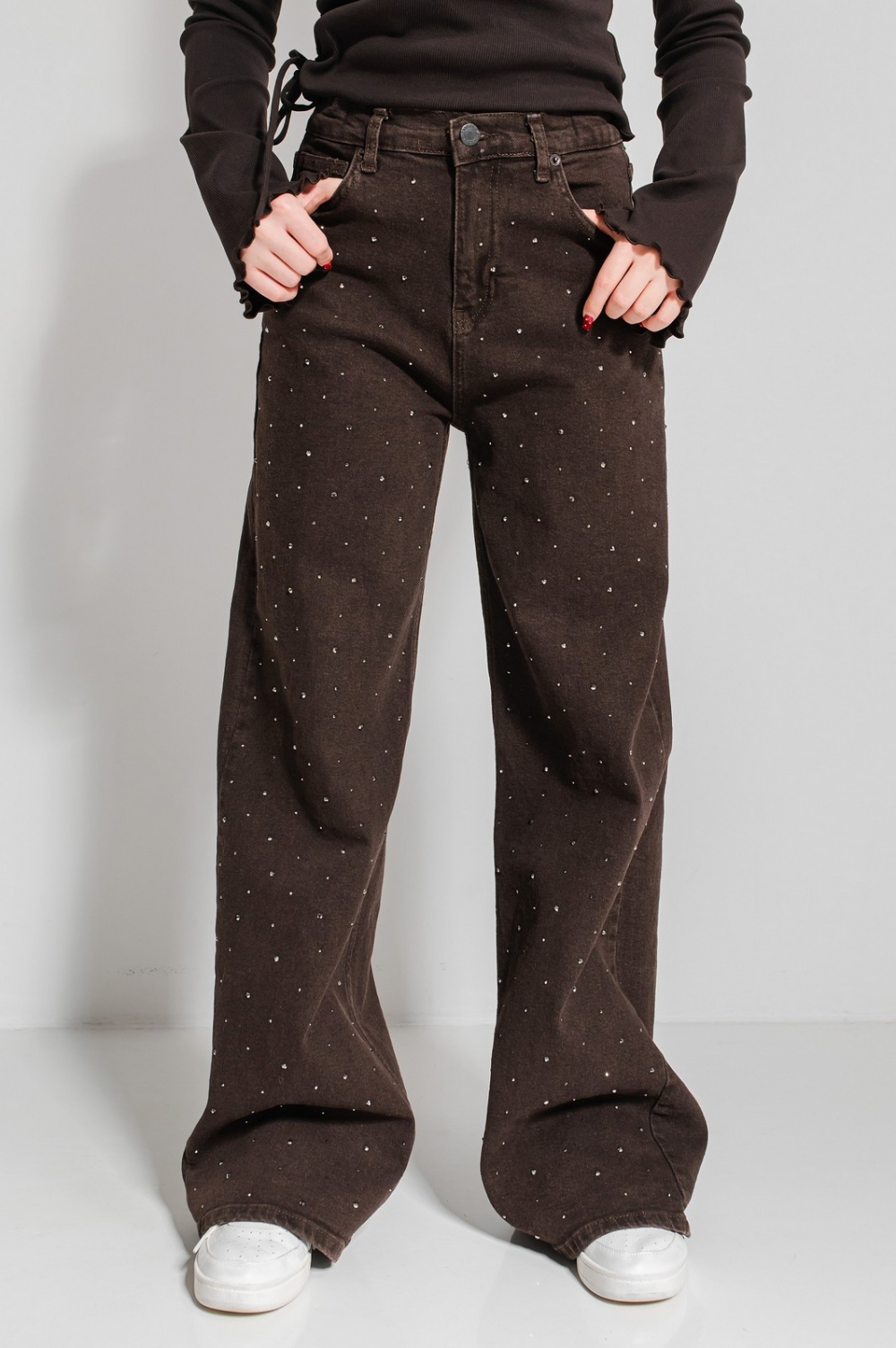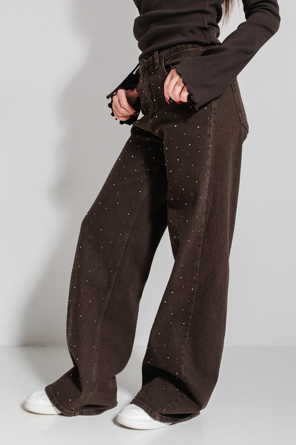 «Марлен» трендового крою палаццо, що візуально подовжує силует. Висока посадка чудово підкреслить талію. Застібка на блискавку та ґудзик. Родзинкою виробу є блискучі камінці по всій довжині, що зроблять твій образ оригінальним та неповторним!