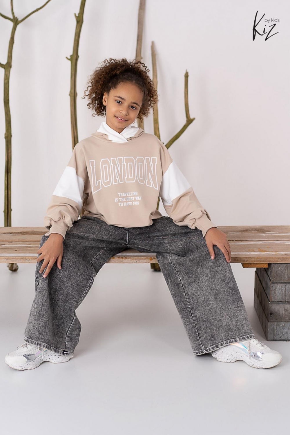 Кофтинка зі спущеним плечем, виготовлена з 3-х нитки начос. Горловина оброблена капюшоном на підкладці. Рукав довгий на манжеті. Передня частина кофти оздоблена фігурною кокеткою. Кофта з пришивним поясом закріпленим оздоблюючою строчкою. Пояс кофти, комір та манжети виконані з качкорсеСостав: 85% бавовна, 10% полиэстер, 5% еластан