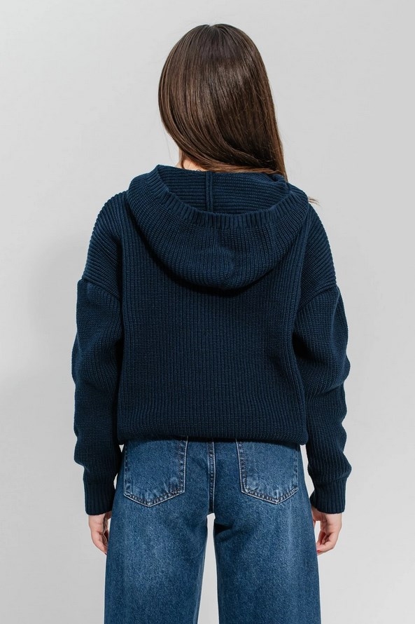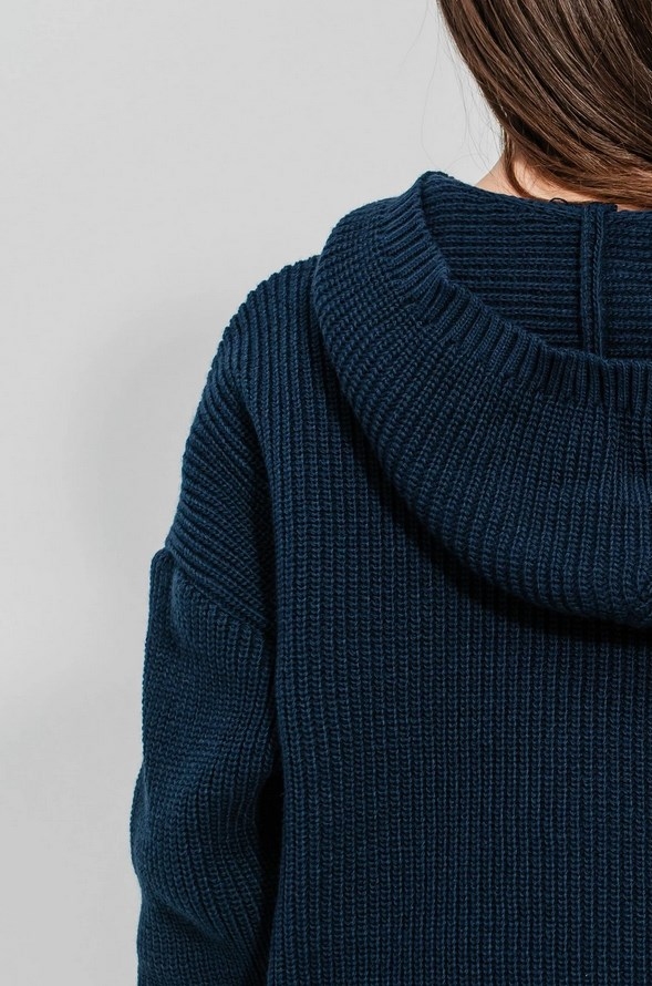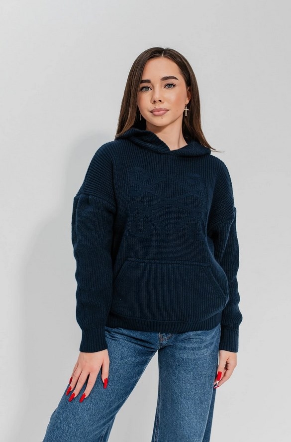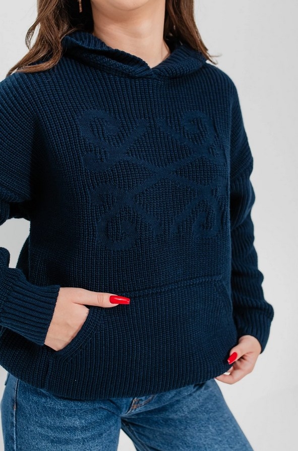 «Валлері» вільного силуету, довжиною до лінії стегон. Модель з фактурним в’язаним візерунком на грудях, що додає образу цікавого вигляду. Також виріб має капюшон і практичну кишеню «кенгуру».