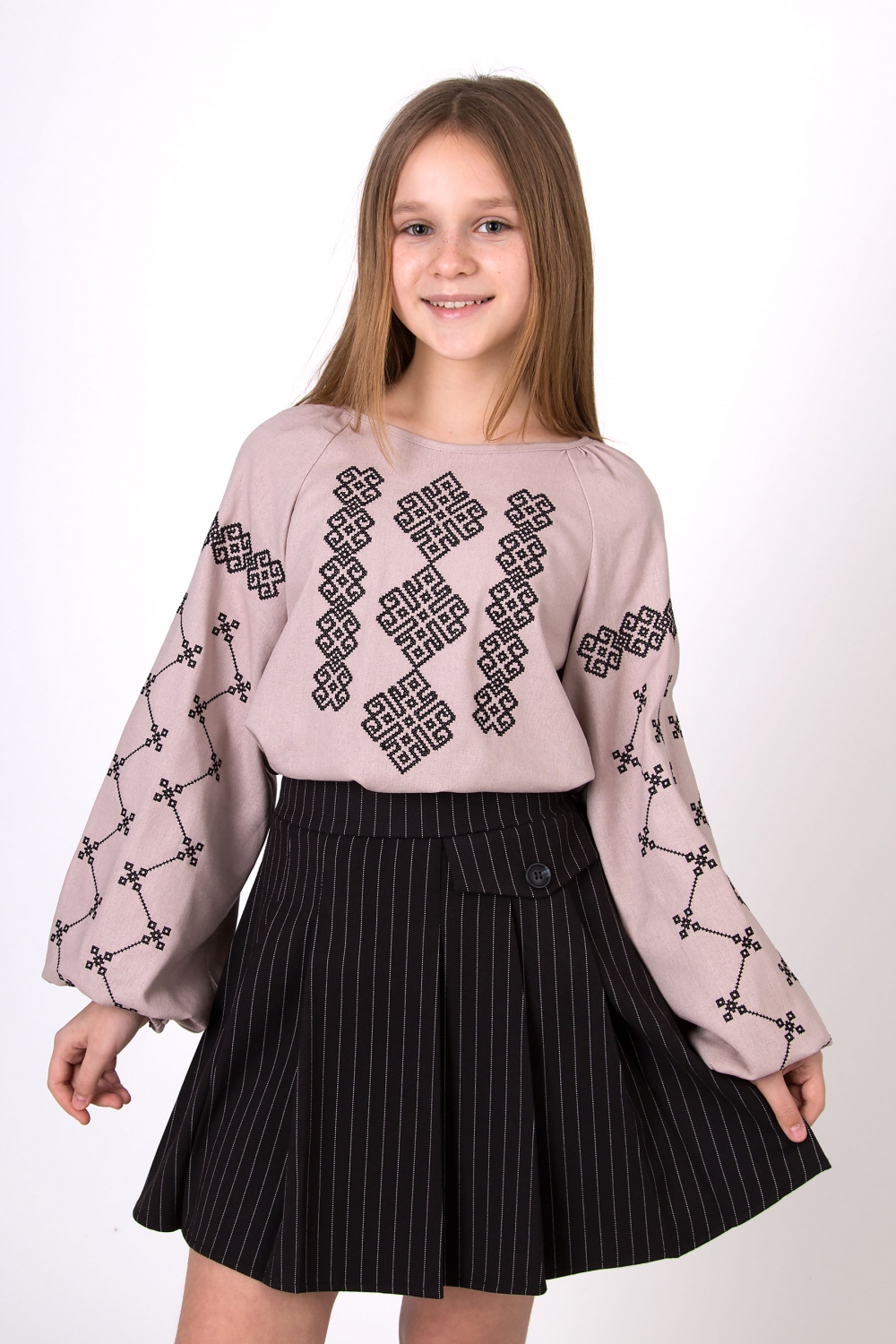 Лляна вишиванка для дівчат Mevis 5515-06, колір бежевий. Дуже гарна вишивана блузка для дівчат середьнього шкільного та підліткового віку виготовлена лляного полотна високої якості. Завдяки, домішкам поліестера, тканина краще зберігає зовнішний вигляд, ніж 100% льон.