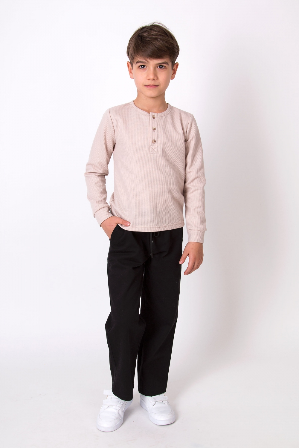 Лонгслів для хлопців Mevis 5648-05, колір бежевий. Лонгслів для хлопчика з довгим рукавом і круглою горловиною. Модель доповнена планкою з ґудзиками, виконана з м’якої фактурної тканини.