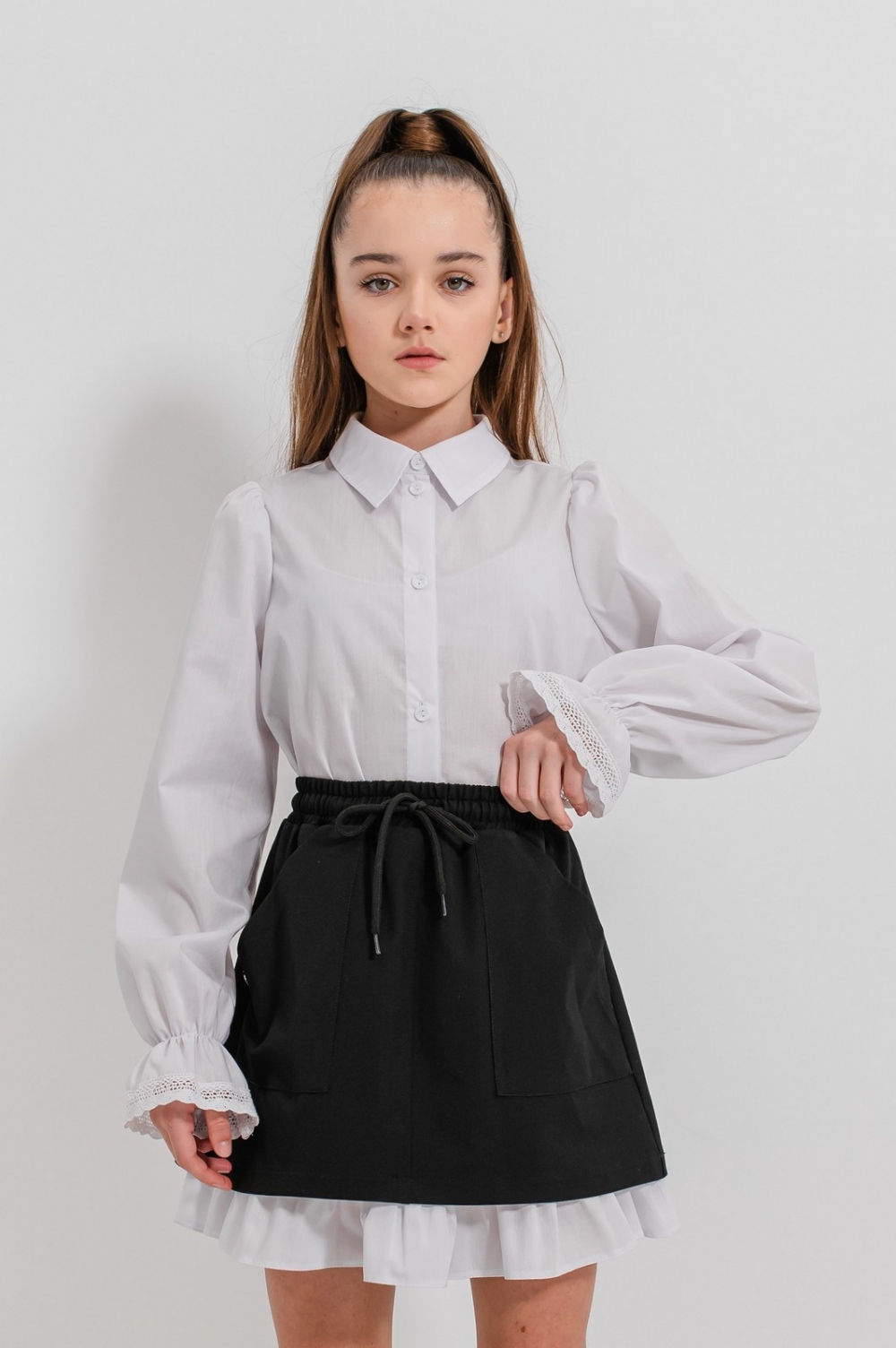 «Бланш» трапецієподібного силуету, довжиною трохи вище лінії колін. Виріб двошаровий. Верхній шар - спідниця з костюмної тканини, а нижній шар - підкладка з пришитою до низу рюшею з сорочкової тканини. Низ рюші дещо виглядає з-під спідниці, що додає образу грайливого настрою. Спідниця з двома накладними кишенями по переду. Пояс на резинці, що додатково регуюється шнурком, що точно вигідно підкреслить фігуру.
