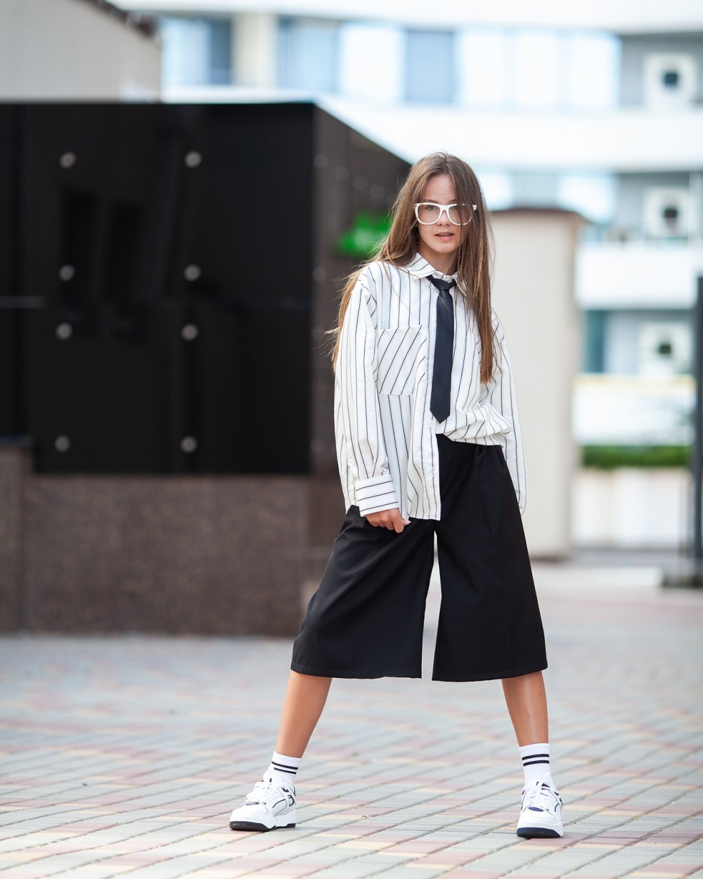 Шорти розширеного до низу силуету довжиною по коліно. Має по дві функціональні кишені спереду. Костюмна якісна тканина з стильні декоративні білі лампаси додають моделі трендовості.