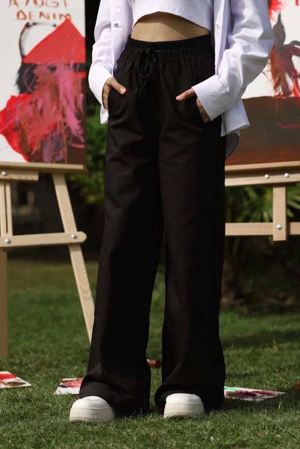 Шкільні штани-палаццо для дівчат A-yugi 9535, колір чорний. Коттонові, зручні штани на комфортній широкій резинці-поясі. Є 2 врізні бічні кишені. Відмінно поєднуються з трикотажними світшотами та бомберами, футболками та сорочками.