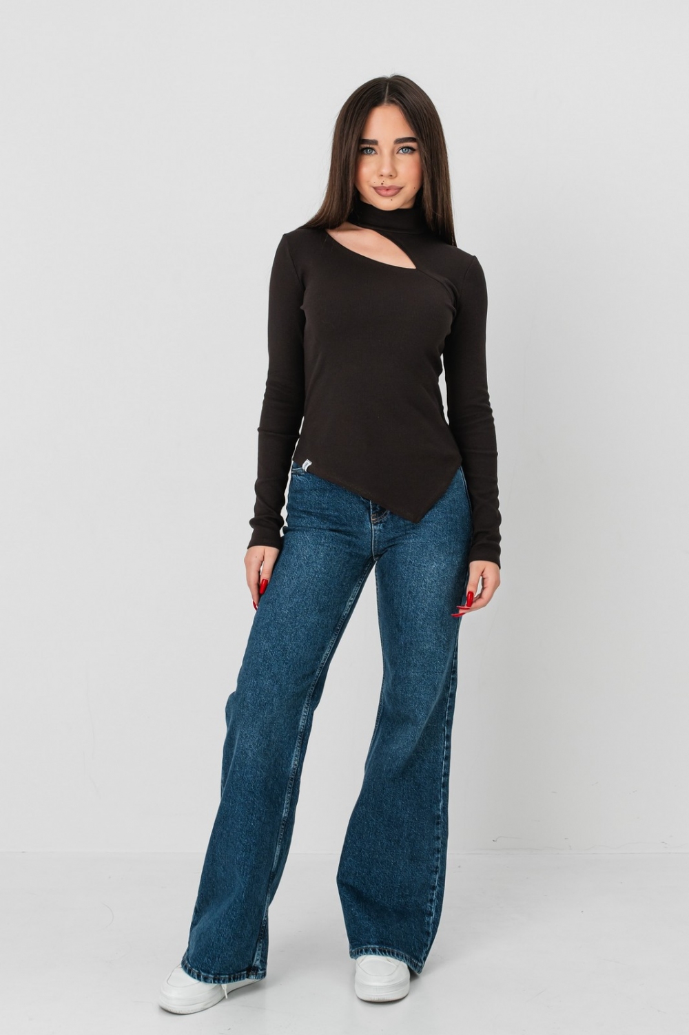 Низ виробу має скошену форму з подовженням попереду, що додає легкості та візуально витягує силует. Рукави — вшивні, одношовні, з м’якою посадкою по руці. -