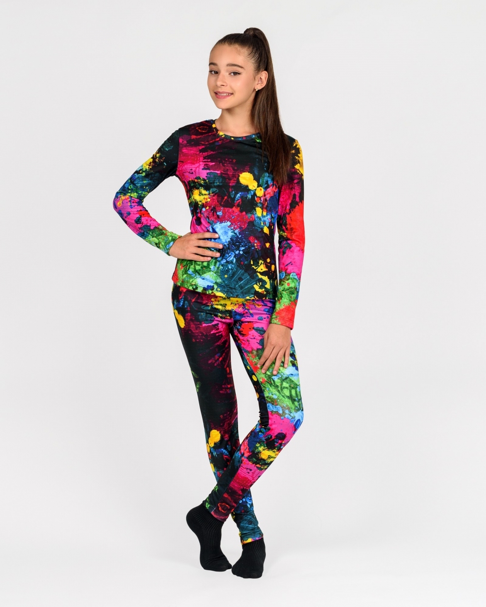 Унікальність цього комплекту полягає в інноваційній тканині термоначіс, яка дарує приємні тактильні відчуття, при цьому відмінно захищає від холоду та дозволяє шкірі "дихати". Принт, нанесений за допомогою сублімаційного друку, вражає яскравими неоновими плямами на чорному фоні. Цей динамічний дизайн, що поєднує яскраві кольори, немов створює сплеск енергії, додаючи позитиву та радості в кожен день. Неонові плями, що переливаються у світлі, надають комплекту сучасного і трендового вигляду, а також підкреслюють індивідуальність маленької модниці.