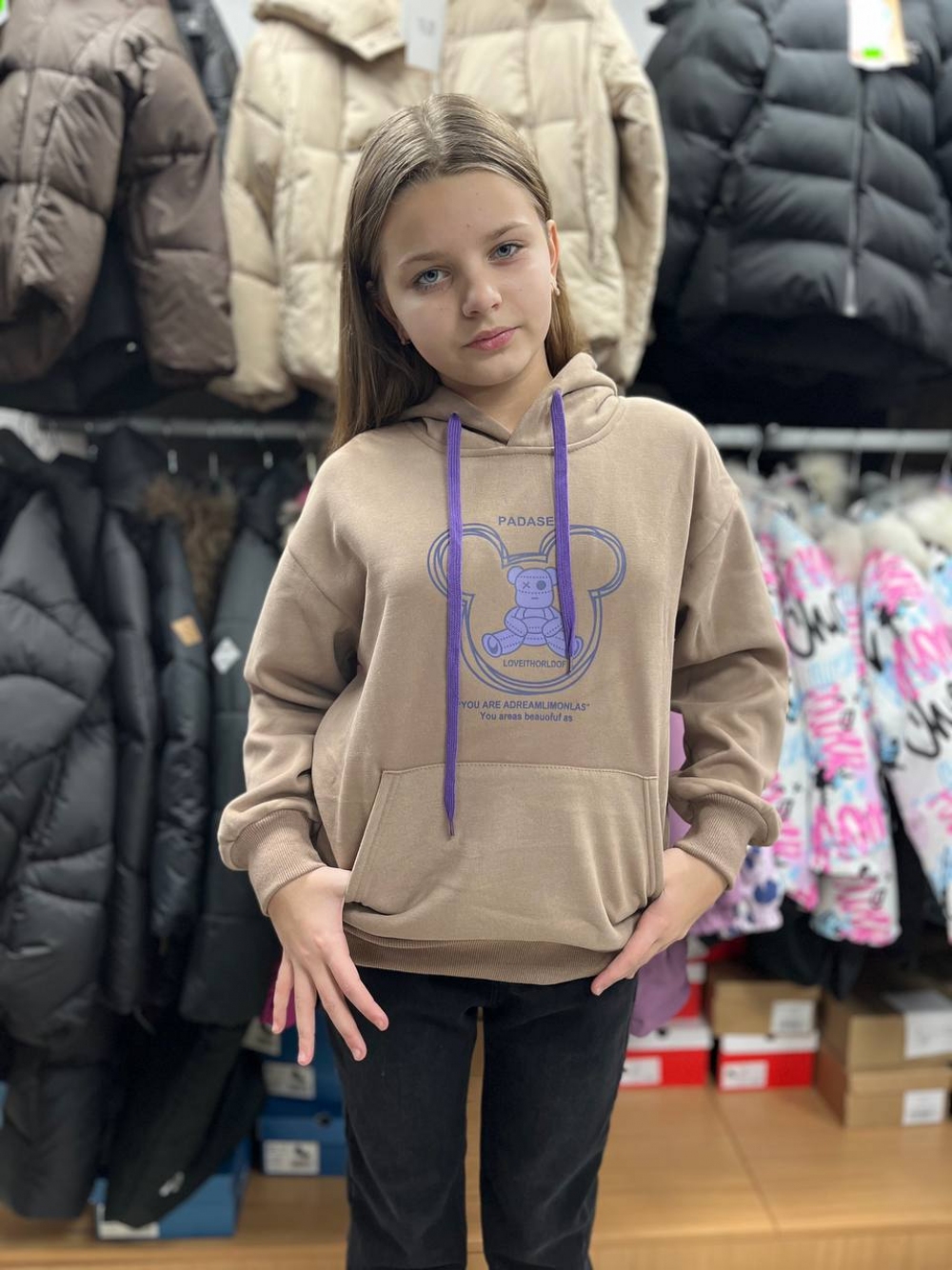 Худі вільного силуету, довжиною до лінії стегон. Горловина оброблена капюшоном на підкладці. Рукав довгий, на довгій манжеті та з отвором для великого пальця, щоб руки точно не замерзли без рукавиць. Низ кофти оброблено широким пришивним поясом з кашкорсе, по шву пришивання прокладено оздоблюючу строчку. В бічних швах залишено високі розпіки, тому під цей верх підійде багато варіантів низу!