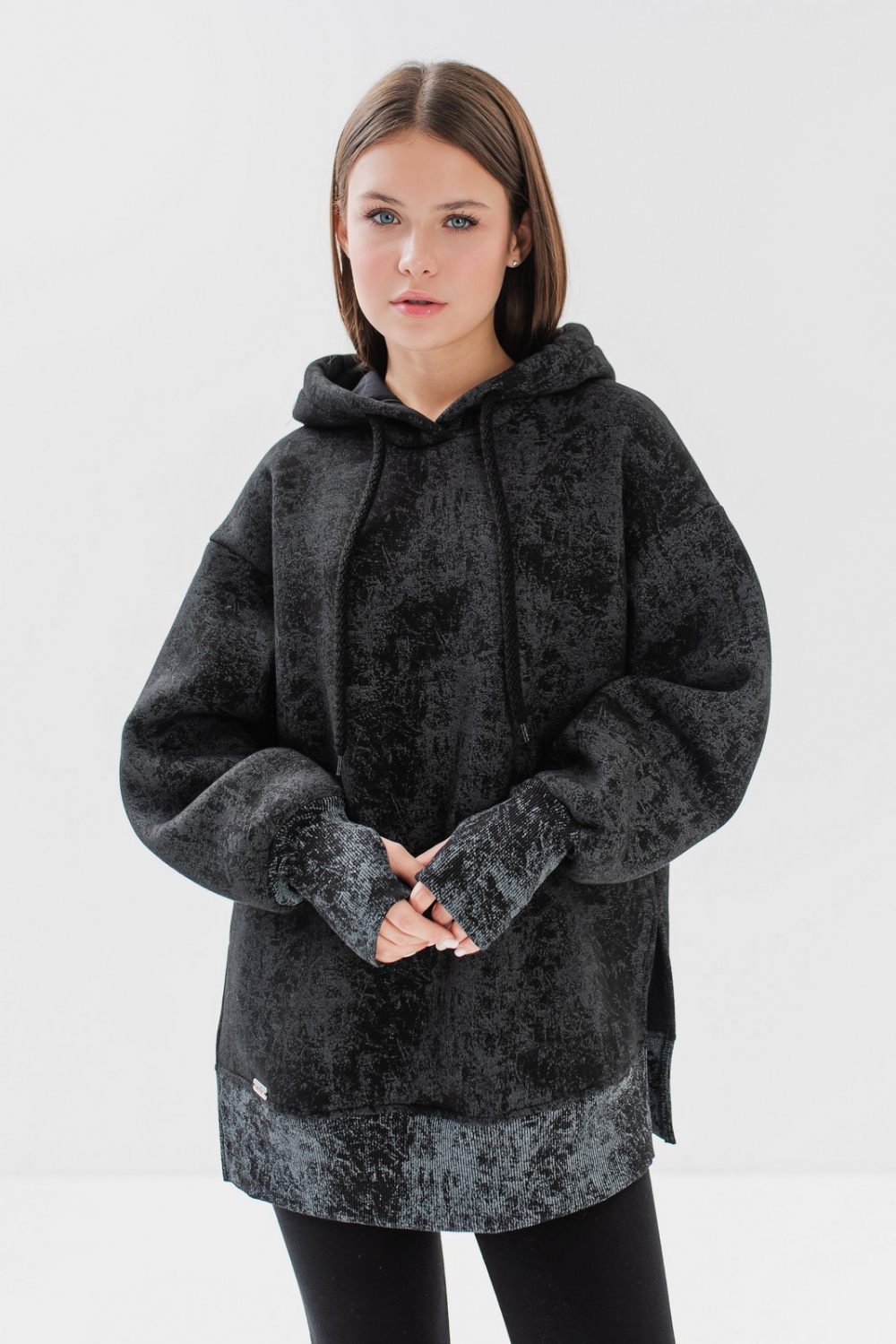 «Джинджер» вільного силуету, довжиною до лінії стегон. Горловина оброблена капюшоном на підкладці. Рукав довгий, на довгій манжеті та з отвором для великого пальця, щоб руки точно не замерзли без рукавиць. Низ кофти оброблено широким пришивним поясом з кашкорсе, по шву пришивання прокладено оздоблюючу строчку. В бічних швах залишено високі розпіки, тому під цей верх підійде багато варіантів низу!