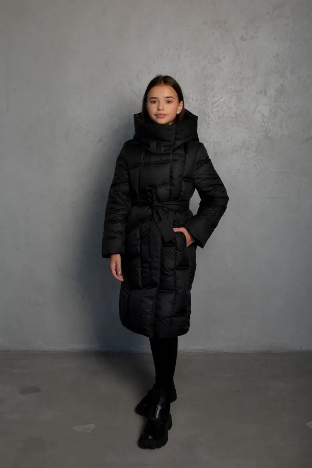 Силует і крій: Пальто має прямий крій з акцентом на талії завдяки поясу, що додає елегантності. Об&aposємний комір надає додаткового захисту від холоду та вітру.