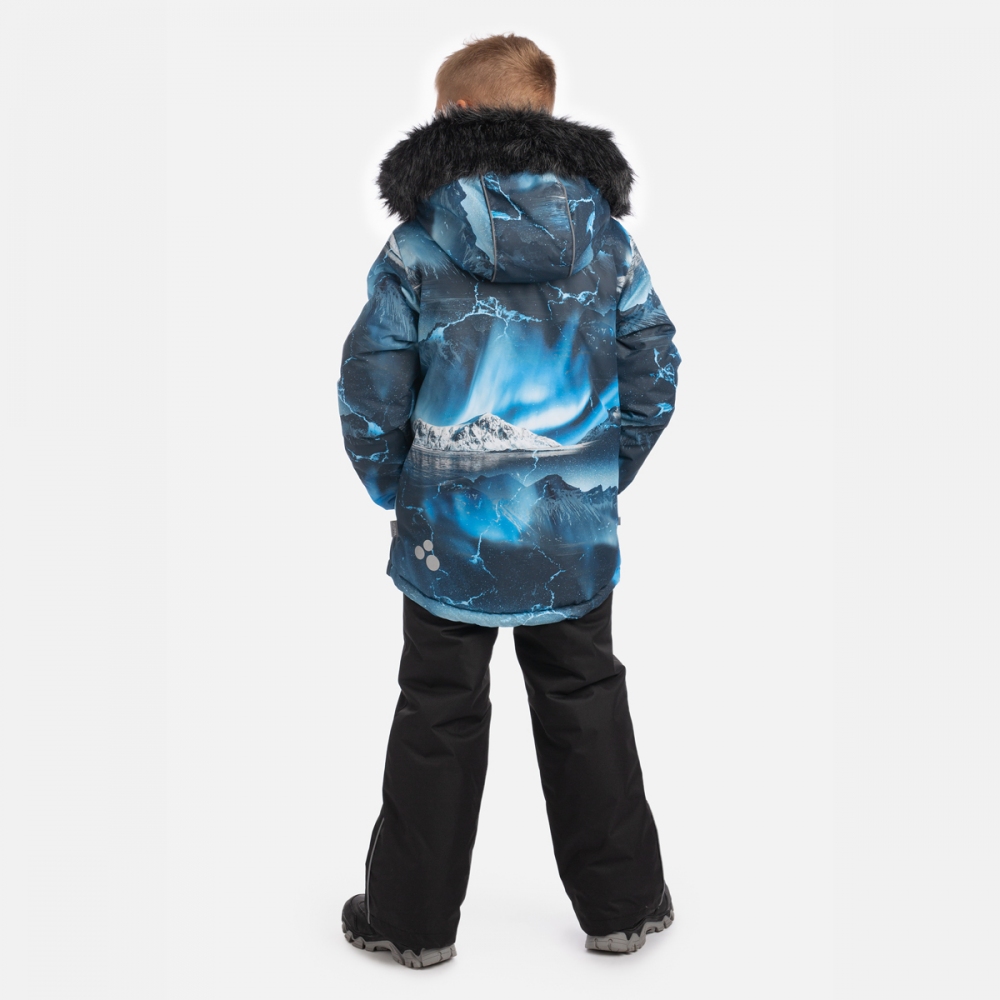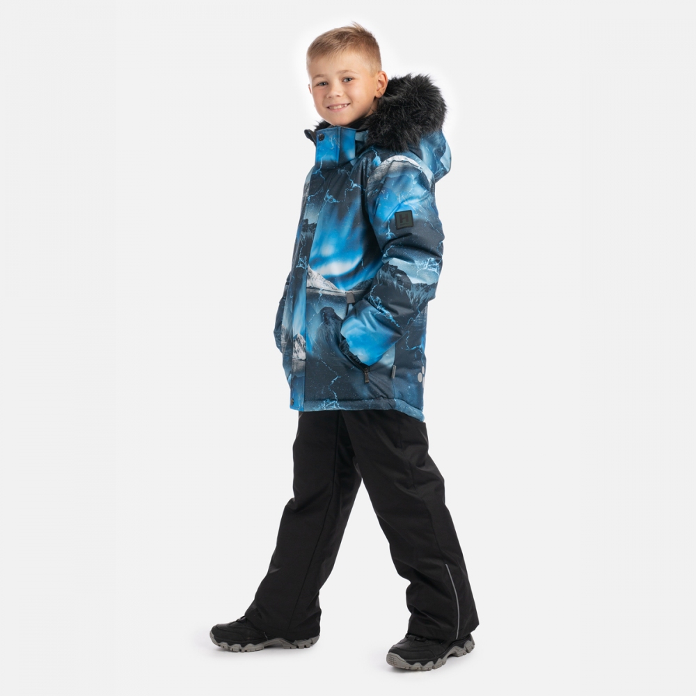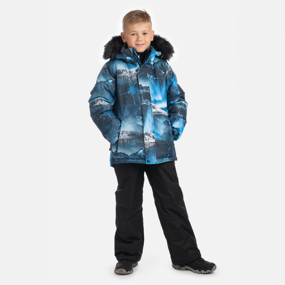 Зимовий комплект для хлопців HUPPA DANTE 2 41930230, колір 52186 з нової колекції Huppa Fashion 2025/2026. Куртка з м'якої мембранної тканини з гарним принтом має подовжений крій, тому краще захищає від холоду та вітру. Манжети на рукавах із м'якою окантовкою всередині. Капюшон з хутряним оздобленням застібається спереду на липучках. За бажання можна відстебнути хутро, а також зняти каптур повністю. Плечові шви проклеєні для кращого захисту від вологи. Прямі штани без спинки, зроблені з міцнішої мембранної тканини, застібаються на блискавку і кнопку. Підтяжки регулюються по довжині та легко знімаються. Кроковий шов проклеєний по всій довжині, тому можна кататися з гірки без ризику промокнути. Внутрішні гетри захищають взуття дитини від снігу.